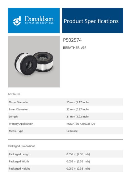 Donaldson P502574 Replaces the Komatsu 421-60-35170
