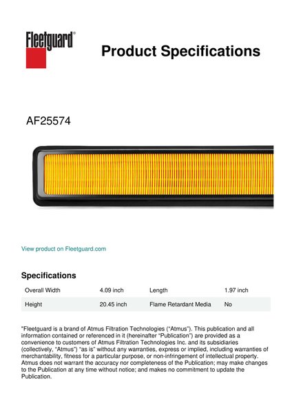 Fleetguard® AF25574 panel cabin air filter provides clean air in the cab which means a clean work environment. Breathing cleaner air can lead to longer and more productive working hours.Specification