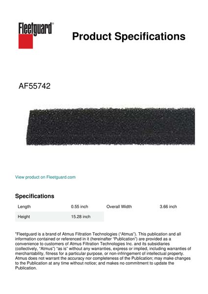 Fleetguard® AF55742 panel cabin air filter provides clean air in the cab which means a clean work environment. Breathing cleaner air can lead to longer and more productive working hours.Specification