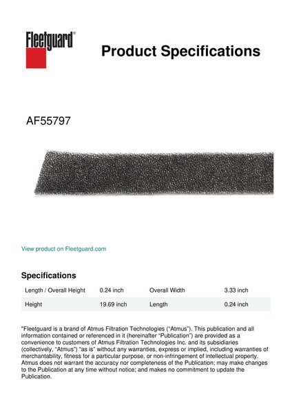 Fleetguard® AF55797 panel cabin air filter provides clean air in the cab which means a clean work environment. Breathing cleaner air can lead to longer and more productive working hours.Specification
