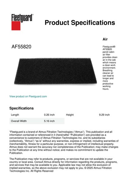 Fleetguard® AF55820 panel cabin air filter provides clean air in the cab which means a clean work environment. Breathing cleaner air can lead to longer and more productive working hours.Specification