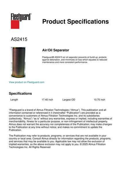 Fleetguard® AS2415 air oil separator prevents oil build-up, protects against detonation, and minimizes oil loss which equates to reduced maintenance and more consistent performance.Specification
