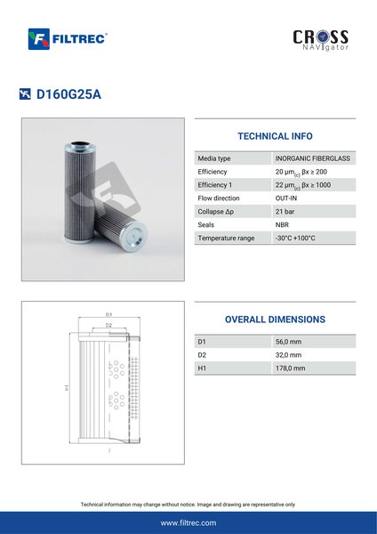 Genuine Filtrec D160G25A. This Filtrec element is designed to meet or exceed the quality and performance of brand OEM’s ensuring superior filtration performance and long-lasting durability.