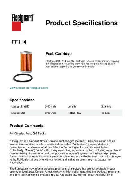 Fleetguard® FF114 fuel filter cartridge reduces contamination, trapping dirt particles and preventing them from reaching the moving parts in your engine supporting longer service intervals.Specification