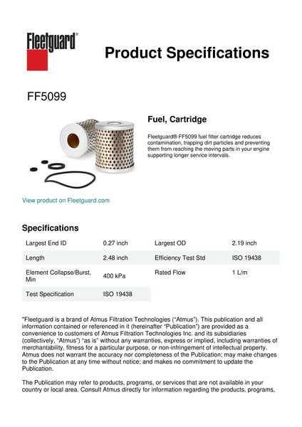 Fleetguard® FF5099 fuel filter cartridge reduces contamination, trapping dirt particles and preventing them from reaching the moving parts in your engine supporting longer service intervals.Specification