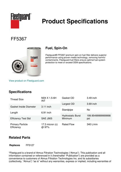 Fleetguard® FF5367 premium spin-on fuel filter delivers superior performance using proven media technology, removing harmful contaminants. Fleetguard fuel filters ensure optimal fuel system protection to meet or exceed OEM specifications.Specification