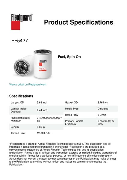 Fleetguard® FF5427 spin-on lube filter meets or exceeds OE performance requirements and the new challenges of modern engine technology.Specification