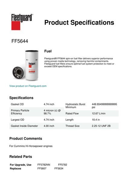 Fleetguard® FF5644 spin-on fuel filter delivers superior performance using proven media technology, removing harmful contaminants. Fleetguard fuel filters ensure optimal fuel system protection to meet or exceed OEM specifications.Specification