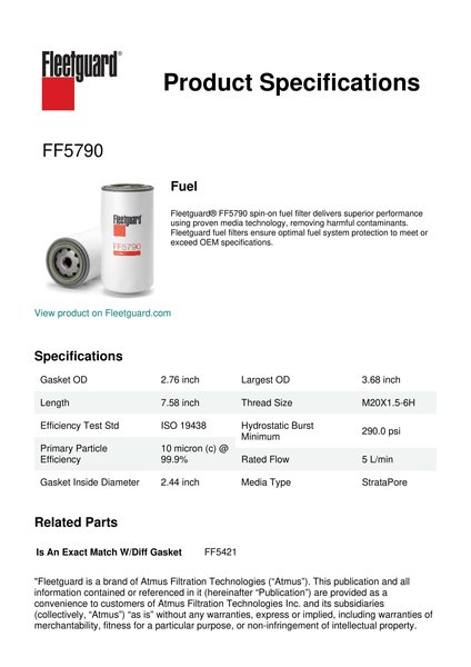 Fleetguard® FF5790 spin-on fuel filter delivers superior performance using proven media technology, removing harmful contaminants. Fleetguard fuel filters ensure optimal fuel system protection to meet or exceed OEM specifications.Specification