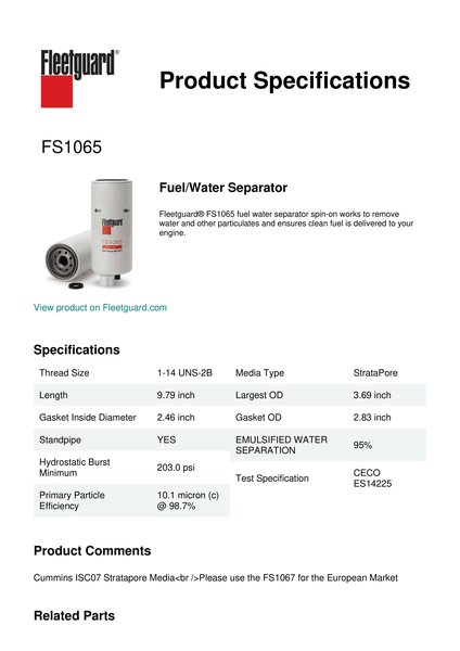 Fleetguard® FS1065 fuel water separator spin-on works to remove water and other particulates and ensures clean fuel is delivered to your engine.Specification