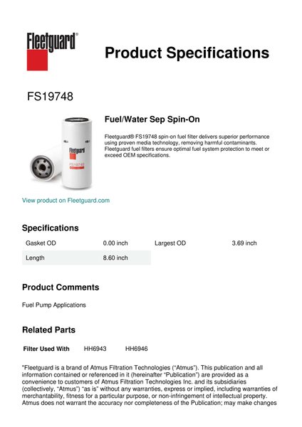 Fleetguard® FS19748 spin-on fuel filter delivers superior performance using proven media technology, removing harmful contaminants. Fleetguard fuel filters ensure optimal fuel system protection to meet or exceed OEM specifications.Specification