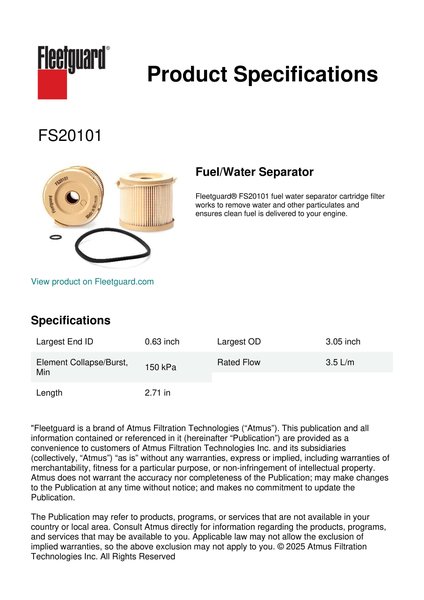 Fleetguard® FS20101 fuel water separator cartridge filter works to remove water and other particulates and ensures clean fuel is delivered to your engine.Specification