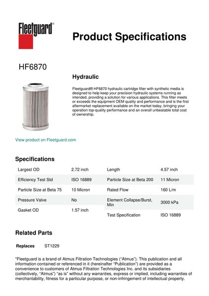 Fleetguard® HF6870 hydraulic cartridge filter with synthetic media is designed to help keep your precision hydraulic systems running as intended, providing a solution for various applications. This filter meets or exceeds the equipment OEM quality and performance and is the first aftermarket replacement available on the market today, bringing your operation top-quality performance and an overall unbeatable total cost of ownership.Specification