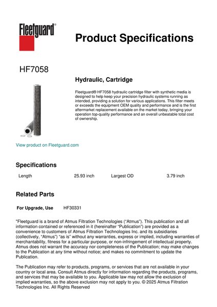 Fleetguard® HF7058 hydraulic cartridge filter with synthetic media is designed to help keep your precision hydraulic systems running as intended, providing a solution for various applications. This filter meets or exceeds the equipment OEM quality and performance and is the first aftermarket replacement available on the market today, bringing your operation top-quality performance and an overall unbeatable total cost of ownership.Specification