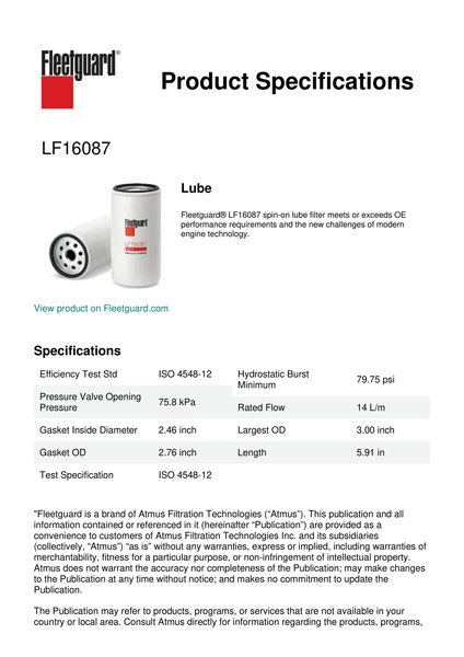Fleetguard® LF16087 spin-on lube filter meets or exceeds OE performance requirements and the new challenges of modern engine technology.Specification