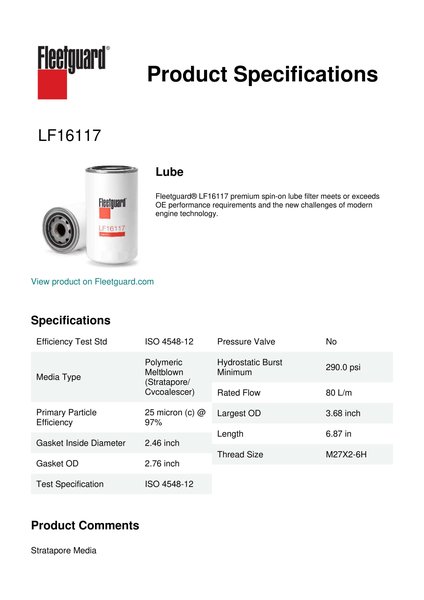 Fleetguard® LF16117 premium spin-on lube filter meets or exceeds OE performance requirements and the new challenges of modern engine technology.Specification