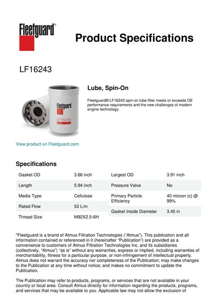 Fleetguard® LF16243 spin-on lube filter meets or exceeds OE performance requirements and the new challenges of modern engine technology.Specification