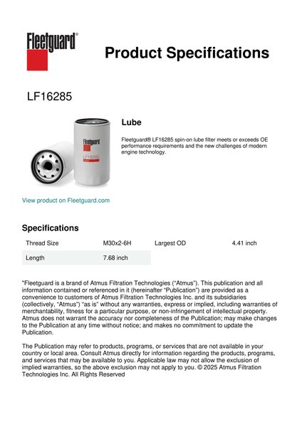 Fleetguard® LF16285 spin-on lube filter meets or exceeds OE performance requirements and the new challenges of modern engine technology.Specification
