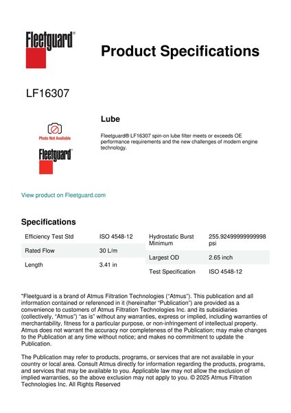 Fleetguard® LF16307 spin-on lube filter meets or exceeds OE performance requirements and the new challenges of modern engine technology.Specification