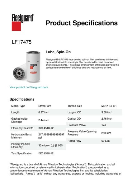 Fleetguard® LF17475 lube combo spin-on filter combines full-flow and by-pass filtration into one single filter developed to meet or exceed engine requirements. This unique arrangement of filtration provides the perfect balance between efficiency and low restriction to oil flow.Specification
