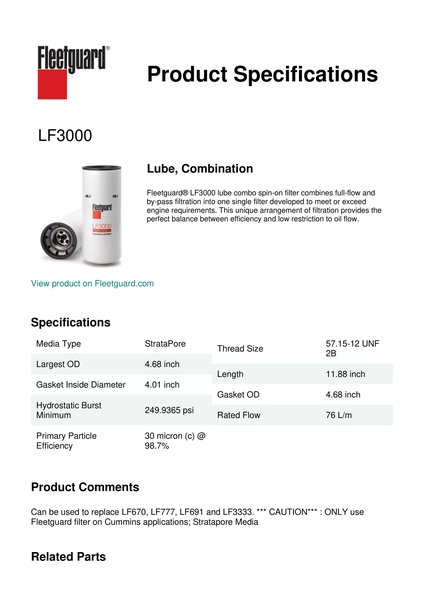 Fleetguard® LF3000 lube combo spin-on filter combines full-flow and by-pass filtration into one single filter developed to meet or exceed engine requirements. This unique arrangement of filtration provides the perfect balance between efficiency and low restriction to oil flow.Specification