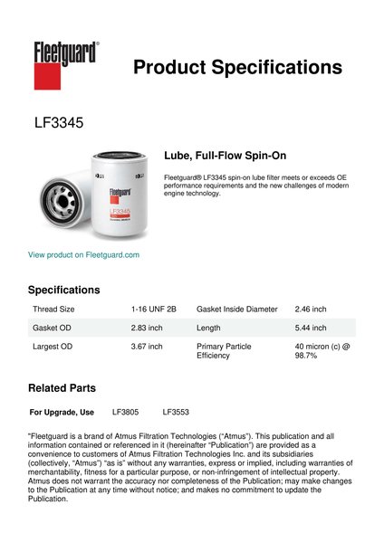 Fleetguard® LF3345 spin-on lube filter meets or exceeds OE performance requirements and the new challenges of modern engine technology.Specification