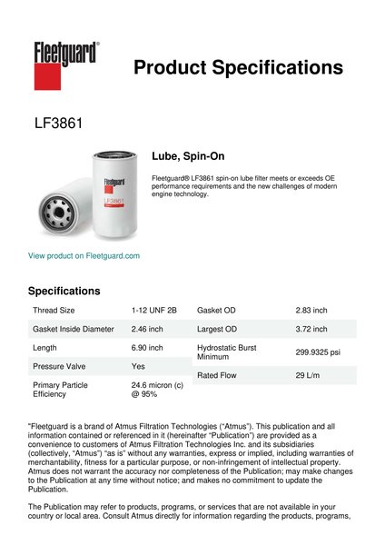 Fleetguard® LF3861 spin-on lube filter meets or exceeds OE performance requirements and the new challenges of modern engine technology.Specification