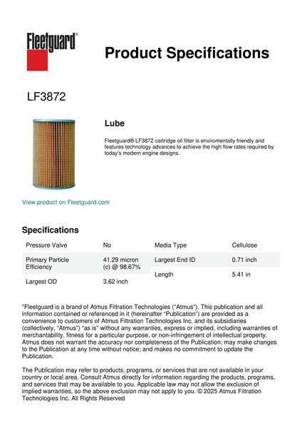 Fleetguard® LF3872 cartridge oil filter is enviromentally friendly and features technology advances to achieve the high flow rates required by today’s modern engine designs.Specification