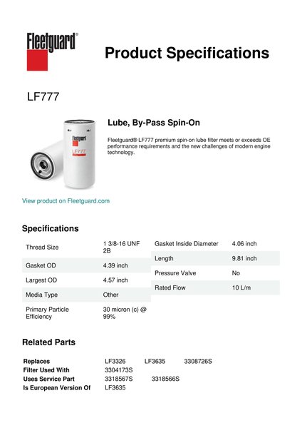 Fleetguard® LF777 premium spin-on lube filter meets or exceeds OE performance requirements and the new challenges of modern engine technology.Specification