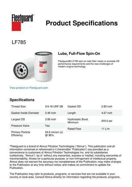 Fleetguard® LF785 spin-on lube filter meets or exceeds OE performance requirements and the new challenges of modern engine technology.Specification