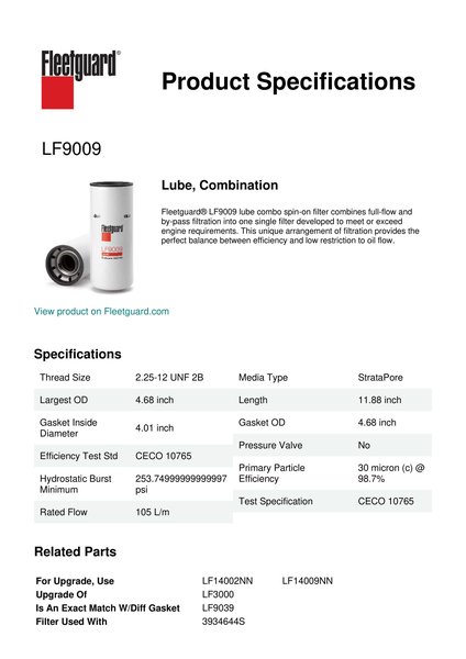 Fleetguard® LF9009 lube combo spin-on filter combines full-flow and by-pass filtration into one single filter developed to meet or exceed engine requirements. This unique arrangement of filtration provides the perfect balance between efficiency and low restriction to oil flow.Specification