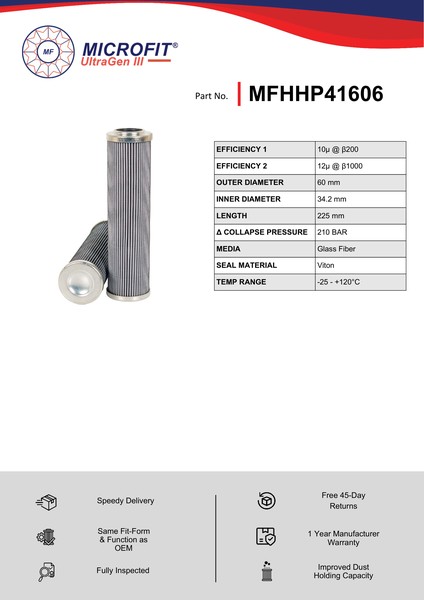Genuine MICROFIT® UltraGen III MFHHP41606. Engineered and manufactured in Great Britain the MFHHP41606 is designed to meet or exceed the quality and performance of OEM quality standards, ensuring superior filtration performance and the longest possible filter life.Building on over 50 years of filtration expertise, the UltraGen III series is the third generation of MICROFIT® filter media, delivering exceptional efficiency and reliability.