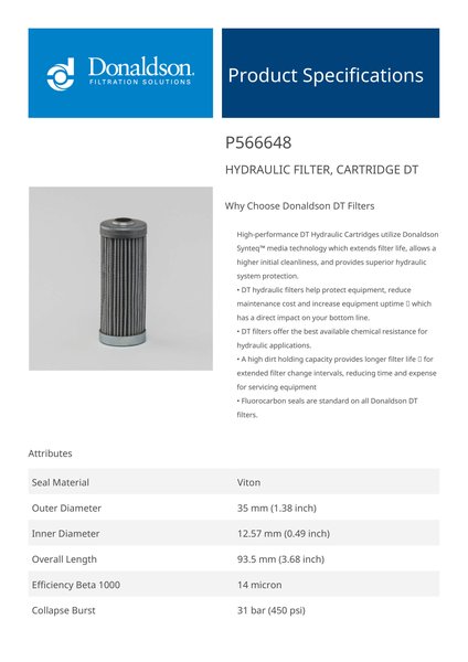 Donaldson P566648 Hydraulic Filter, Cartridge Dt