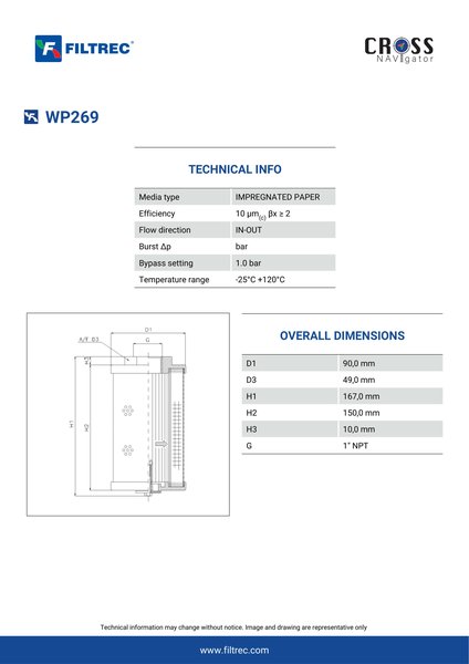 Engineered with their high performance media and a durable design, the WP269 provides reliable and consistent performance over its lifespan, even in harsh operating environments. When you order from FilterFinder, you can trust that you are getting a reliable and high-quality replacement filter that will keep your system running smoothly.